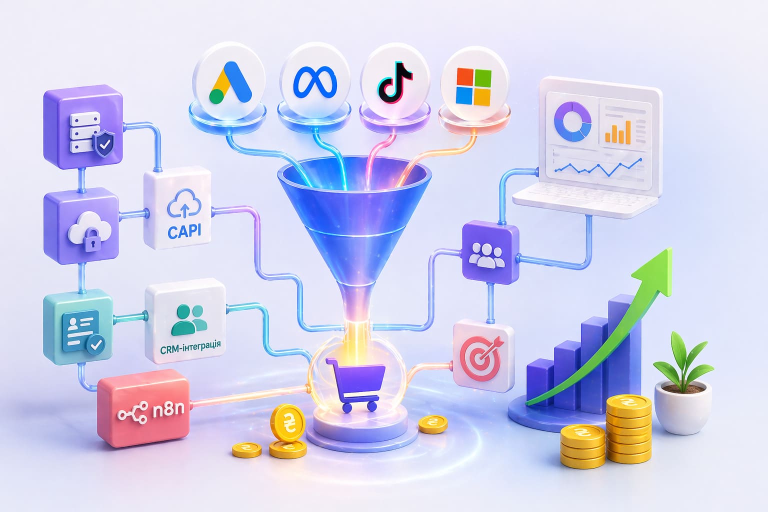 Так, це наш стандарт роботи у 2026 році. Через обмеження браузерів та iOS (ITP), стандартний Pixel часто втрачає до 40% даних. Ми налаштовуємо передачу даних на стороні сервера (Server-side tracking) та CAPI, що дозволяє алгоритмам рекламних платформ (Meta, Google) отримувати повні дані про конверсії. Це критично для коректної роботи AI-оптимізації ставок.